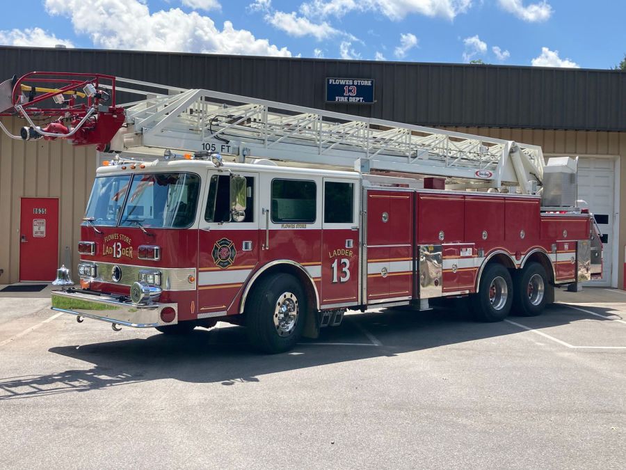 Formerly introducing Ladder 13. This truck is not new but it is new to us. This 90's model Pierce 105' aerial formerly served a small department in NY. It was very well taken care of and has a lot of life yet to give. The project started several years ago to replace our former rescue truck either with a larger rescue truck or ladder truck. We were able to find this truck that had the space we needed to carry all the equipment from the former rescue truck, met our size requirements, and also offered an aerial ladder, aerial waterway, full compliment of ground ladders, and a small water tank and pump. While there are no high rise buildings in the Flowes Store area, there has been a lot of larger new houses built in the area that are the size of a 3 story building and have roofs with a very steep pitch. These challenges can make our job very difficult when we need to access upper floors and roofs with ground ladders. This truck will help us to overcome those challenges and make our job a little easier and safer. Personnel have been training with this truck since the first of the year and Ladder 13 officially went into service in May of 2021.